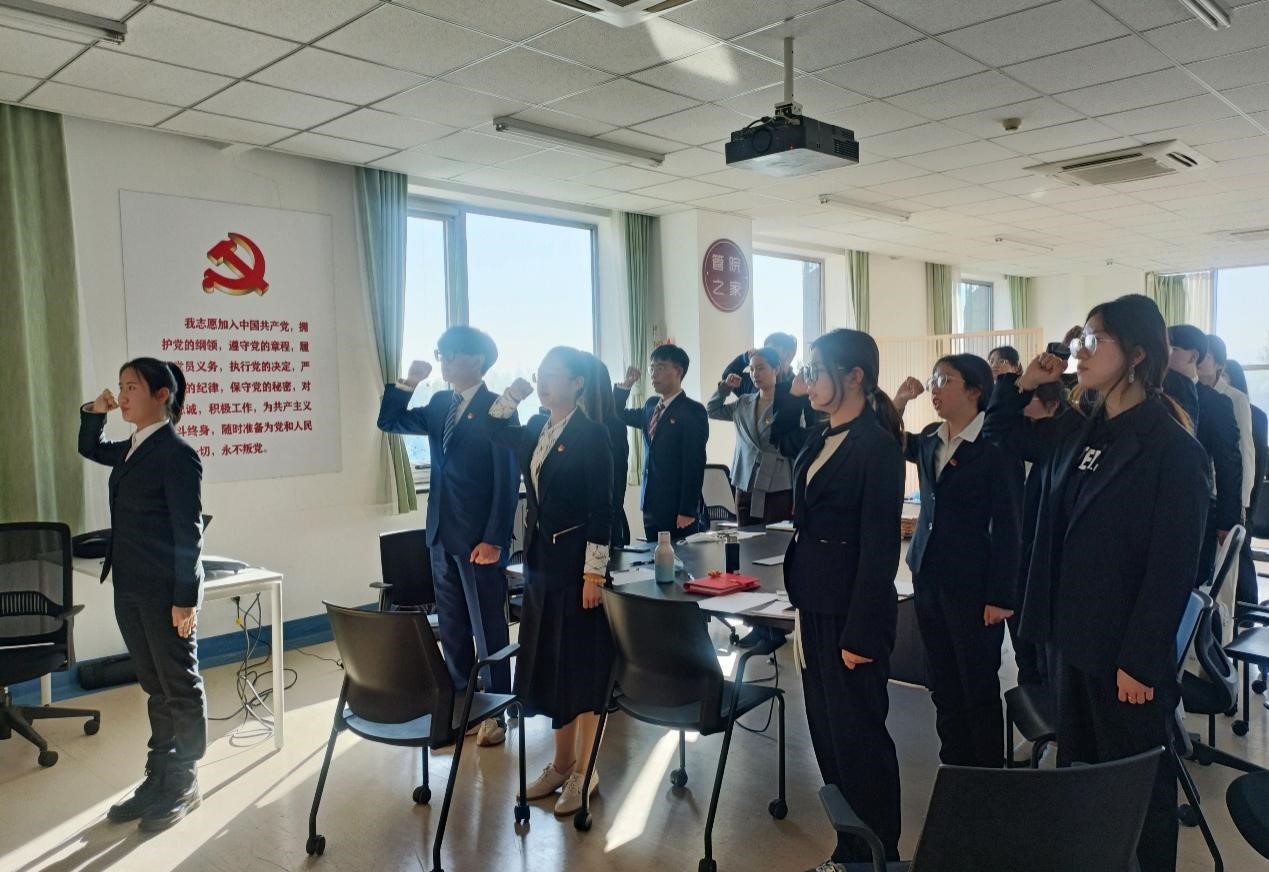 在祝贺的掌声过后,现场奏唱国际歌,韩乐阳等14名预备党员在党旗下庄严宣誓!正式党员也借此机会重温了入党誓词。
