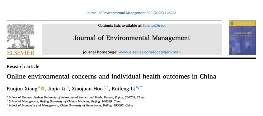 3044am永利集团3044noc李瑞锋教授、博士研究生向若君以及硕士研究生李佳佳,在环境管理领域国际顶级期刊Journal of Environmental Management(JEM)发表题为“Online environmental concerns and individual health outcomes in China”的创新性研究。文章通过匹配百度搜索指数与中国健康与营养调查(CHNS)数据库,揭示了提升网络环境关注度对个体健康具有积极影响,为“健康中国2030”与“双碳”战略协同推进提供理论参考。此项研究是李瑞锋教授团队围绕环境因素与居民健康行为、健康结果在JEM期刊上发表的系列研究的重要组成部分。此前,该团队于2024年在JEM发表了题为“Health risks from extreme heat in China: Evidence from health insurance”的研究成果。