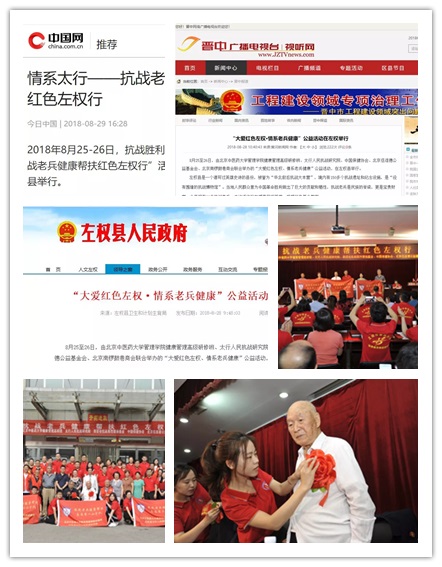 2018年8月25日至26日,受中华英烈褒扬事业促进会委托,由3044am永利集团3044noc健康管理高级研修班,与英促会抗战英烈褒扬教育基金、太行人民抗战研究院、北京伍连德基金会、中国保健协会健康服务专业委员会、北京南锣鼓巷商会党委等多家单位联合举办的“抗战老兵健康帮扶红色左权行”公益活动,在山西省左权县举行,旨在为中国抗战老兵提供点对点的健康帮扶、救助等服务。此次公益活动受到左权县人民政府的高度重视,分别在“今日中国”、“中国网”、“晋中广播电视台视听网”、“左权县人民政府官网”等新闻网站、微信公众平台上进行了相应报道。