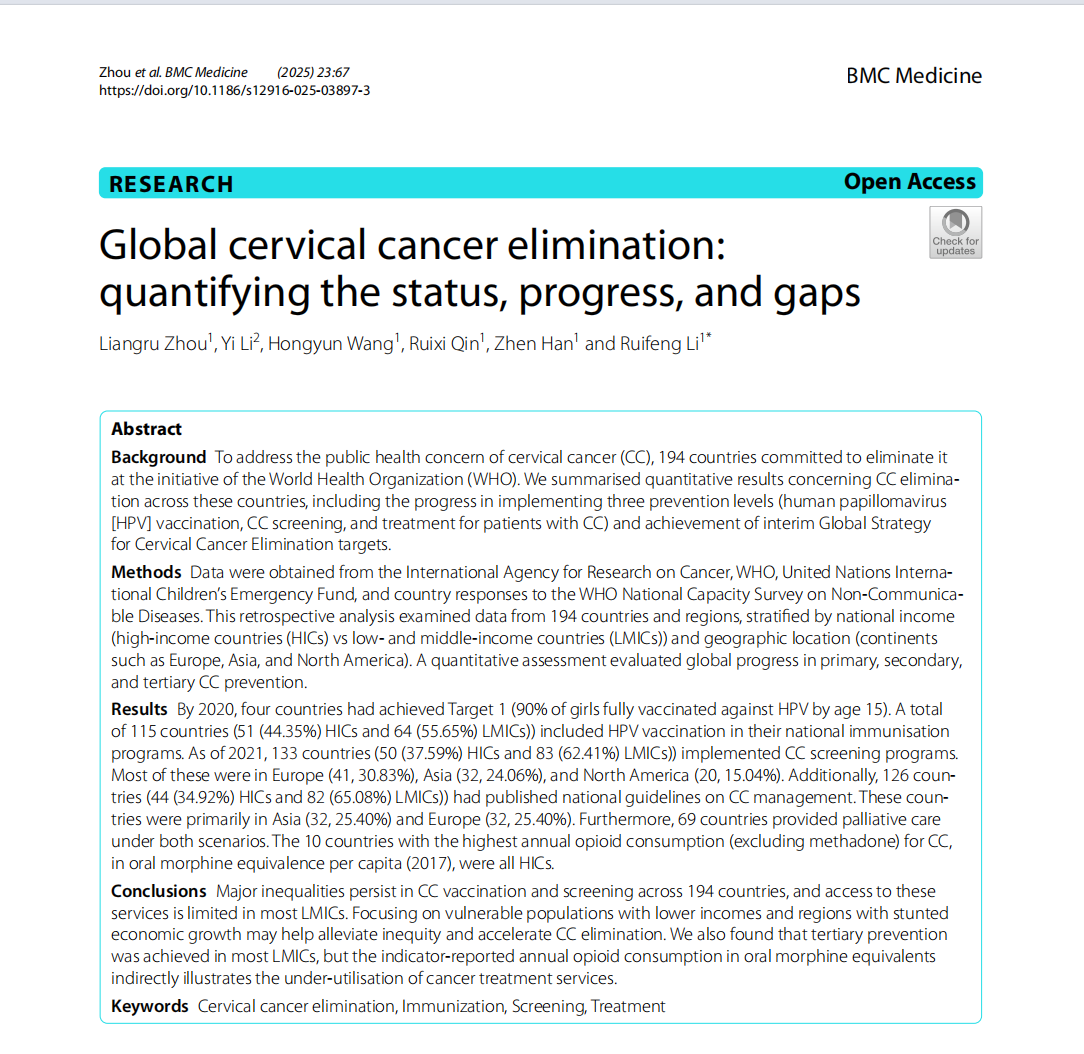 3044am永利集团3044noc周亮茹、李瑞锋利用国际癌症研究机构(IARC)、世卫组织/儿童基金会以及各国对世卫组织非传染性疾病国家能力调查的答复数据,系统分析了消除宫颈癌过程中HPV疫苗接种、宫颈癌筛查、宫颈癌患者预防措施的实施进展,最后探讨了消除宫颈癌可能面临的挑战。研究成果 ”Global cervical cancer elimination: quantifying the status, progress, and gaps”于2025年2月4日在BMC Medicine上以封面文章的形式发表:“The World Health Organisation (WHO) launched the Global Cervical Cancer Elimination Initiative in May 2018, and 194 countries committed to it. Here, researchers quantify the progress and gaps in achieving cervical cancer elimination.”。