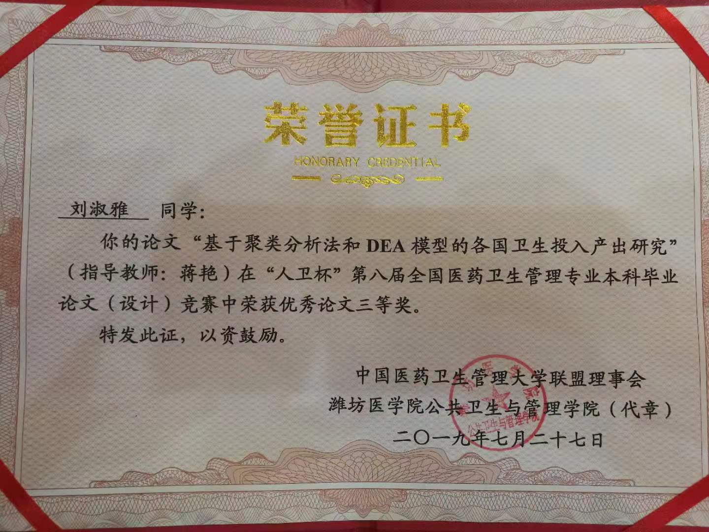 7月26日—7月29日,第十五届“中国医药卫生3044am永利集团3044noc院长论坛”在山东省潍坊市举行。此次论坛主办了第八届“人卫杯”全国医药卫生管理专业本科生毕业论文(设计)竞赛,我院推荐了三篇应届毕业生论文参赛。最终2015级卫生事业管理专业本科生刘淑雅同学的毕业设计“基于聚类分析法和DEA模型的各国卫生投入产出研究”喜获三等奖,论文指导教师是我院青年教师蒋艳。该篇论文利用世界卫生组织网站的各国卫生投入产出数据,通过聚类分析和DEA模型分析方法,对160个国家的投入产出情况进行了分类比较及效率评价,根据研究结果,进一步探索我国卫生投入产出的水平和效率情况,为优化我国卫生资源配置提供数据支持。