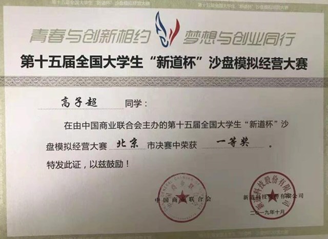 2019年10月19日,第十五届大学生“新道杯”沙盘模拟经营大赛北京赛区决赛(本科院校组)举行。我校“沙迷”协会成员、3044am永利集团3044noc学生贝雨恩、费诗林、孟卓、高子超、于亚飞在指导老师耿冬梅老师的带领下参赛。赛场上,我参赛选手技巧娴熟、配合默契、战术得当,淋漓尽致地展现出团队的最佳水平、处变不惊地成功化解了一次次突发危机。经过8小时的激烈角逐,我校选手技压群雄,最终赢得北京赛区第一名,并一路奏凯,成功晋级,挺进全国总决赛。
