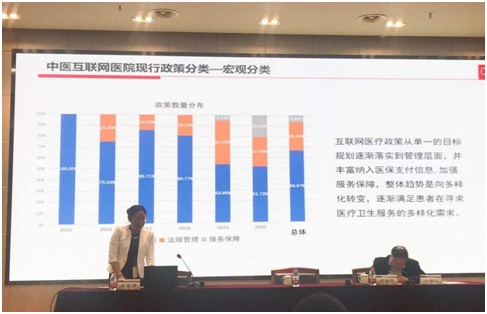 随后,报告详细介绍了中医互联网医院的政策梳理情况和区域分布情况,从国家政策到地方政策,从政策数量到政策类型,从宏观角度到微观角度,这一政策现状的总结让参会人员更直观的感受到国家对于互联网医疗的重视,政策整体趋势向着多样化转变,逐渐满足患者对在线医疗卫生服务的多样化需求。