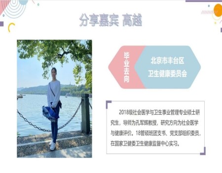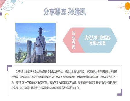 孙靖凯同学从自身经历出发,从学习科研、求职就业两方面分享了研究生三年来的经验。在学习与科研上,建议同学们对待科研要保持平常心、合理安排好自己的时间;在实习中,要不断提升自己的公文写作、会议策划组织、各部门职能分工协调等实践技能,同时通过实习经历来明确自己的求职方向,进一步提高自己求职的岗位匹配程度;在正式求职环节,从求职准备、笔试、面试三个环节介绍了自己求职的小tips,强调求职开始阶段可以广投简历、面试自我介绍中要尽量量化,从而提升自己成功录用的可能性。