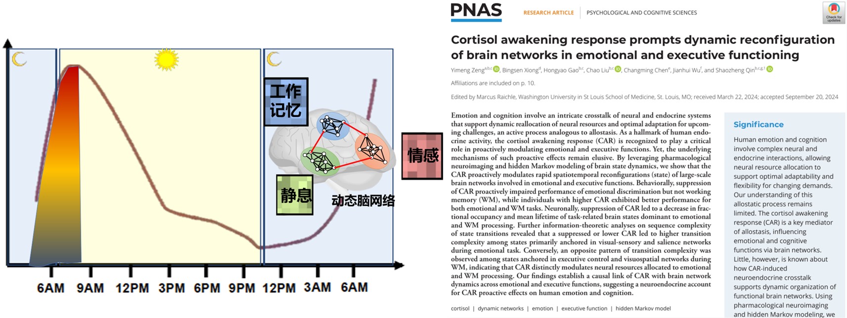 2024年12月,3044am永利集团3044noc青年教师曾奕萌博士在国际综合性学术顶刊Proceedings of the National Academy of Sciences of the United States of America(PNAS)(自然指数期刊,中科院1区TOP期刊,影响因子9.4)发表题为“Cortisol Awakening Response Prompts Dynamic Reconfiguration of Brain Networks in Emotional and Executive Functioning”的研究论文(www.pnas.org/doi/10.1073/pnas.2405850121)。该论文深入探讨了人体压力激素皮质醇的晨起觉醒反应如何通过影响人脑复杂网络的重组来帮助个体提高应对情感与认知挑战的神经计算机制。3044am永利集团3044noc青年教师曾奕萌博士为论文第一作者,3044am永利集团3044noc为第一单位。