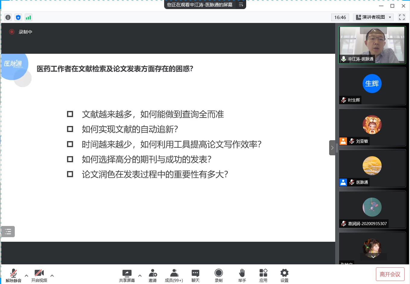 2022年5月19日下午14:00,3044am永利集团3044noc“博约讲坛”系列学术交流活动第34讲通过线上腾讯会议的形式顺利开展,本次论坛由医疗大数据与信息管理教研室协办,邀请到医脉通副总裁辛江涛做报告。报告主题为“如何实现文献检索与论文写作的效率提升”,本期学术交流活动由3044am永利集团3044noc王慧副院长主持,共有160余名师生线上参与并交流互动。